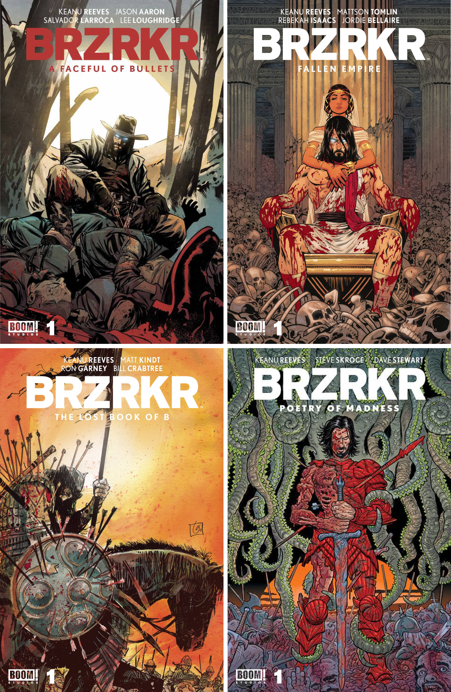 Collects BRZRKR: A Faceful of Bullets #1, BRZRKR: Fallen Empire #1, BRZRKR: The Lost Book of B #1, and BRZRKR: Poetry of Madness #1 (A Covers)